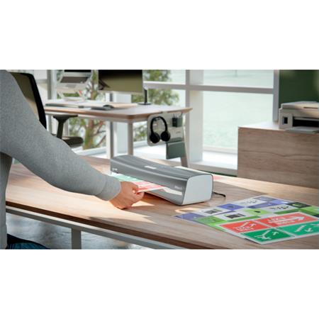 A modern és kompakt Leitz iLAM Office laminálógép zökkenőmentesen egyesíti a stílust és a hatékonyságot. A lamináláshoz Leitz UDT laminálófóliák használata javasolt